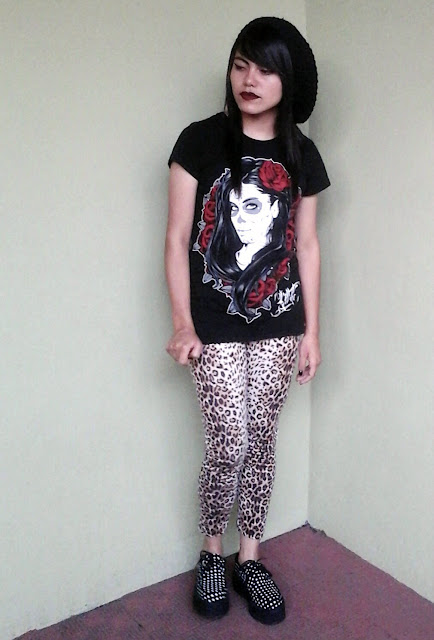 Bueno, estaba dudando en subir estas fotos porque creo que la luz no me acompaño de buena forma hoy, pero aquí están haha, adquirí esta blusa con un diseño de "Mujer Sugar Skull" hace como 2 meses de Alt Girl Things (tienda local en IG) y me encanta el diseño, todos los detalles en la cara de la mujer y las rosas rojas, decidí combinarlo con estas leggings de leopardo que tengo desde hace como 3 años, pero siguen como nuevas!, además este sombrero que adquirí en 2011 creo, el cual no uso mucho pero decidí usarlo esta vez para darle un aspecto diferente al look. Y por último pero no menos importante mis súper cómodos Polka Dot Creepers - perdonen la falta de fotos esta vez , prometo subir más a la próxima.