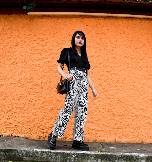 Estos pantalones tienen su propia historia: los pedà en una talla más grande de lo que suelo usar y no me quedaban, asà que tuve que enviarlos a una costurera porque créanme, parecÃan un saco de papas en mi jajaja. Llegando al punto acá, como el estampado de cebra ya está atrayendo toda la atención en este combo, la forma más fácil de combinarlo para mà fue con una blusa negra con un montón de botones; pueden ver claramente que la blusa es algo formal, pero aquà viene el giro para hacerlo "alt", ¿Cuál serÃa? ¡Bueno, los Jadons! De otra manera, definitivamente recomendaré usar este tipo de pantalones con patrones como el estampado de cebra es con camisas de bandas , ¡seguro que haré ese combo muchas veces haha! También anadà un cincho de anillo y un peculiar collar.